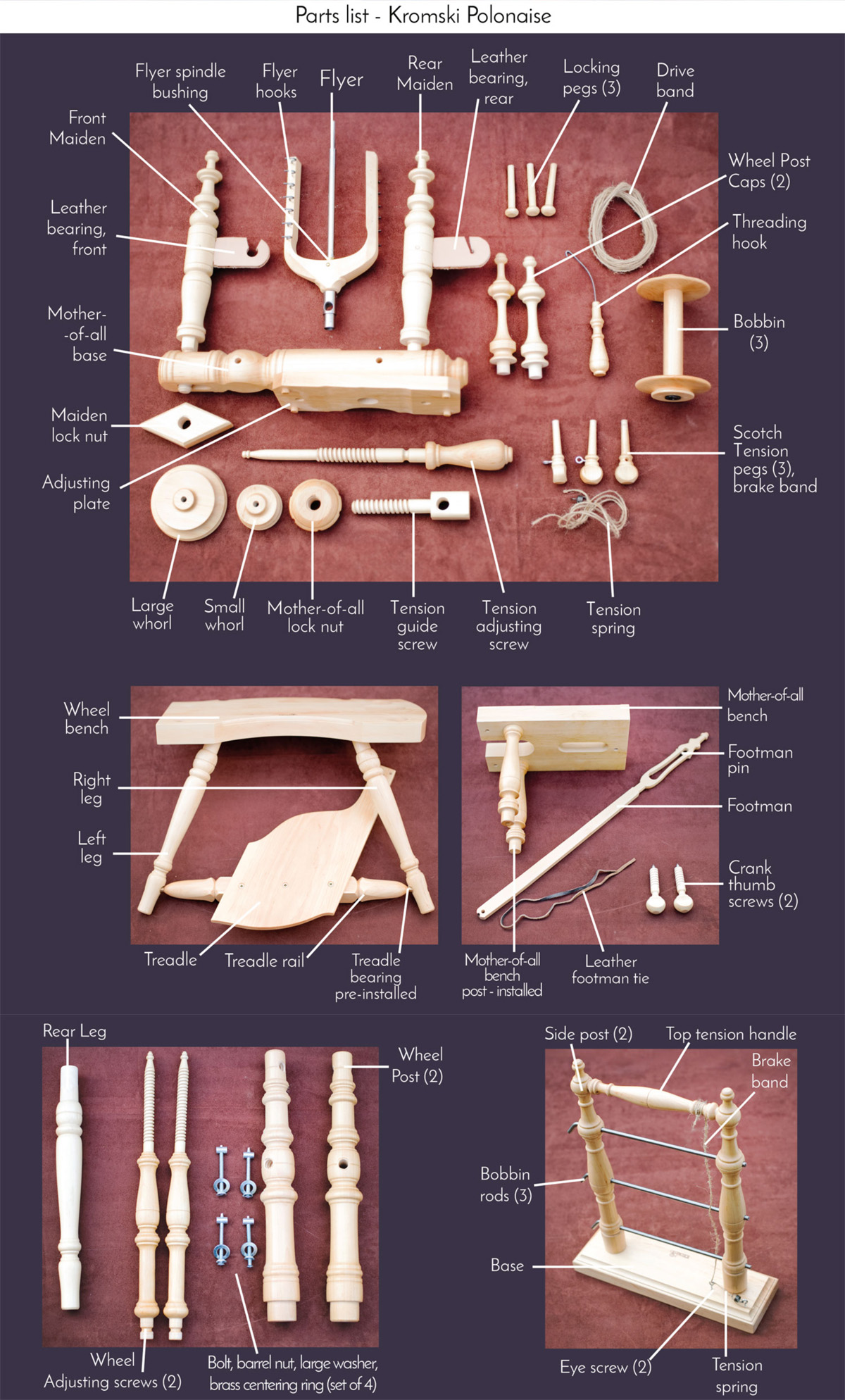 완벽하게 작동하는 목재 휠 조정 및 장력 조정 나사를 통해 각 개별 스피너가 이 모델의 휠 각도 및 플라이어 정렬을 정확하게 보정할 수 있습니다. 뛰어난 디테일과 장인 정신으로 인해 Polonaise는 Kromski가 생산하는 가장 바람직한 휠 중 하나입니다. Polonaise가 제공하는 모든 설득력 있는 기능과 신뢰할 수 있는 성능으로 인해 앞으로 몇 년 동안 소중한 가보이자 대화 주제가 될 것입니다.