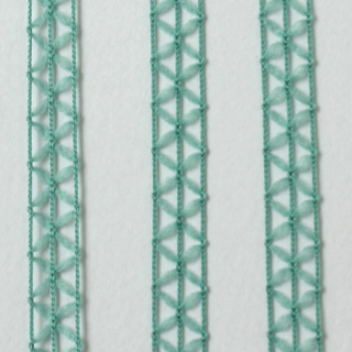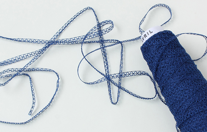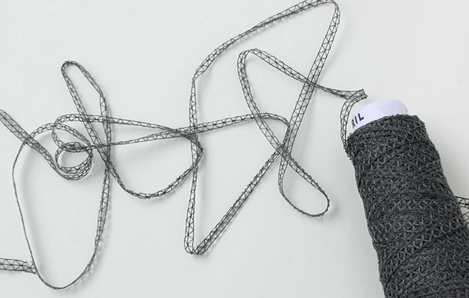 이 원사는 레이첼 워프 뜨개질 기계에 의해 만들어졌으며, 선로와 같은 사다리 모양을 보여줍니다!