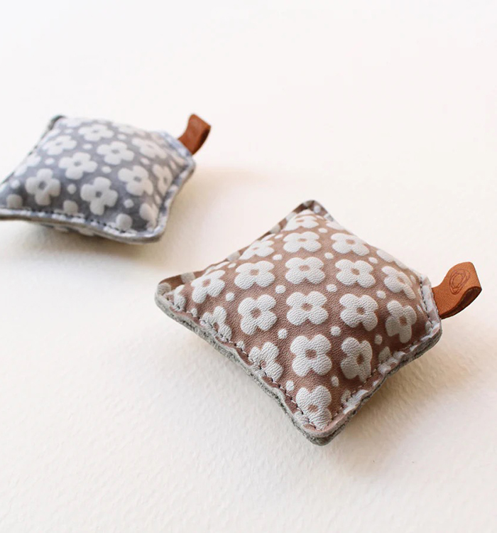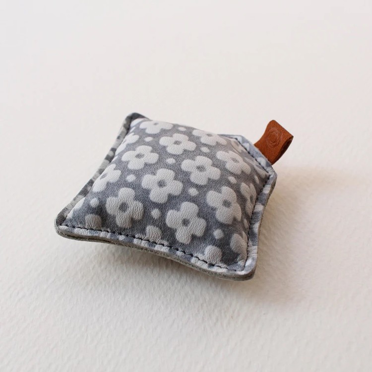 유젠 가죽으로 만든 손 크기의 가방이며, 작은 철 입자가 내부에 채워져 있습니다.