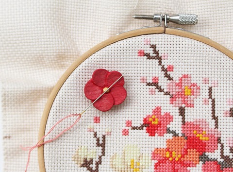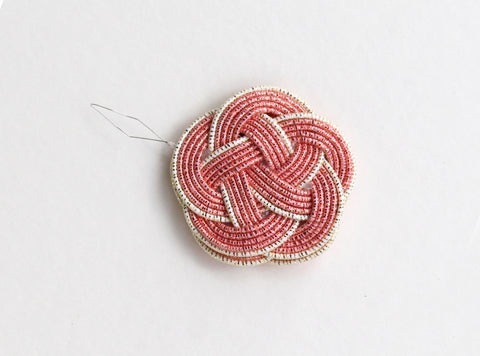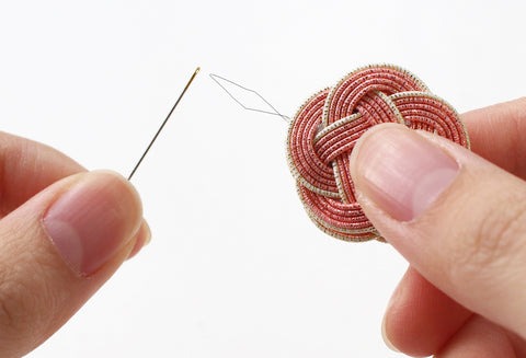 바늘 끼우개 손잡이는 나가노현에서 대대로 전해져 내려오는 전통 수공예품인 이이다 미즈히키로 만들어졌습니다. 미즈히키는 "우메 무스비"라는 매듭으로 묶습니다. 이 매듭은 우메 꽃이 겨울을 이겨내고 봄보다 먼저 피어나기 때문에 행운의 문을 여는 의미를 가진 길조 매듭입니다.