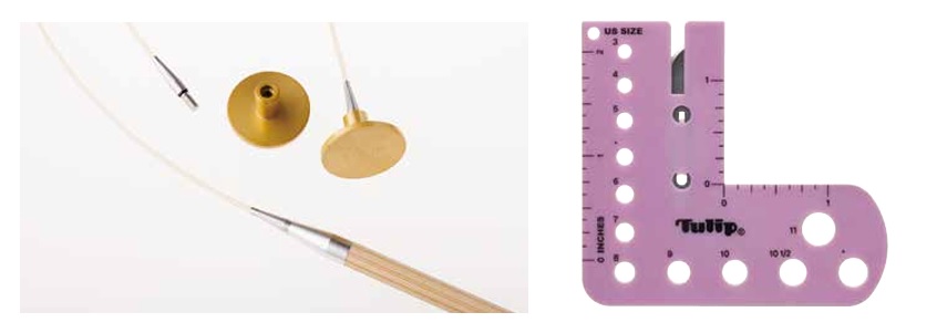 얀 커터가 들어있는 게이지 자는 휴대하기 편리하고, 구멍의 크기를 이용하여 바늘의 크기를 알 수 있습니다.