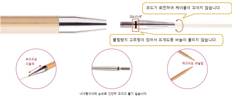 케이블과 바늘의 연결부는 풀림방지 고무링이 있어 뜨개도중 바늘이 풀리지 않고,