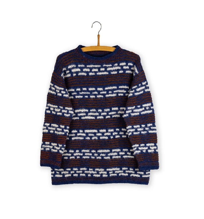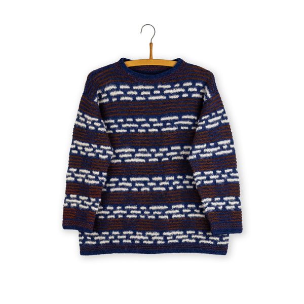 The pullover is worked from the bottom to the top with 5 cm wide strips alternately in shadow knitting and in a “cloud” pattern as done in the swatch.