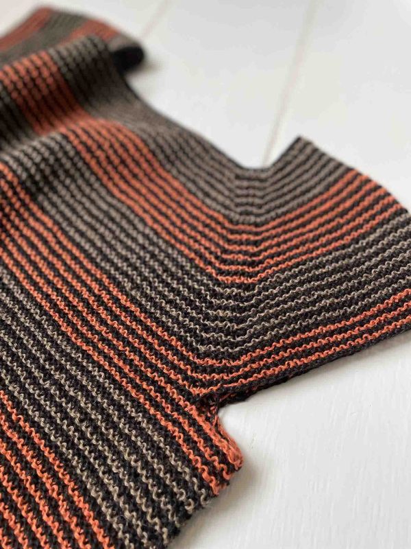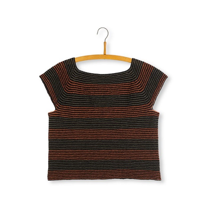 The sweater is knitted in garter stitch using circular needles and worked from top to bottom.