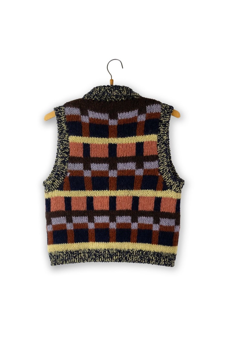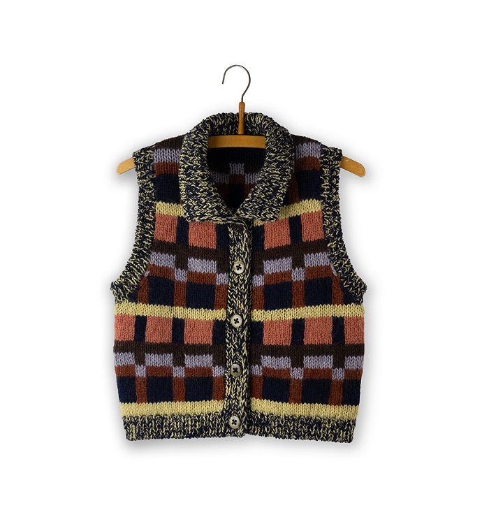 The vest is worked from the bottom up with mélange rib edges worked in 2 contrasting colors,