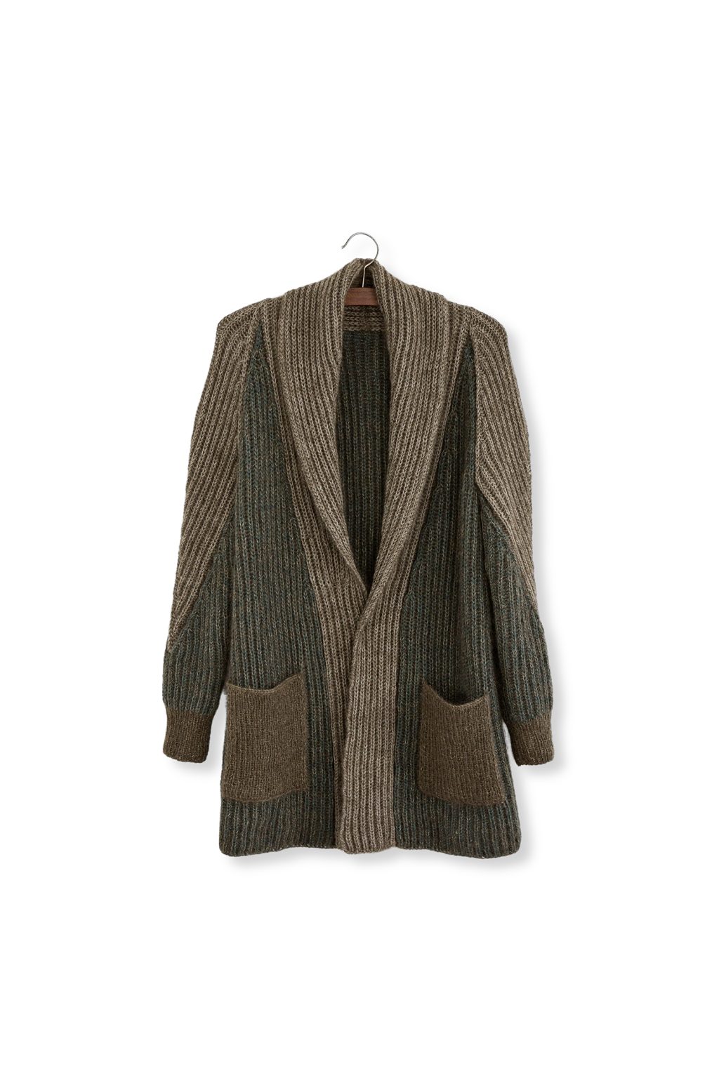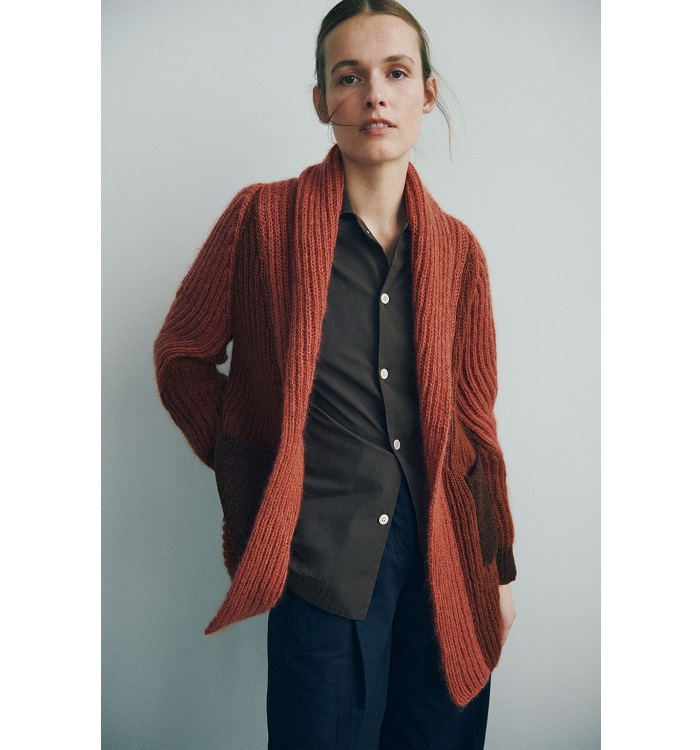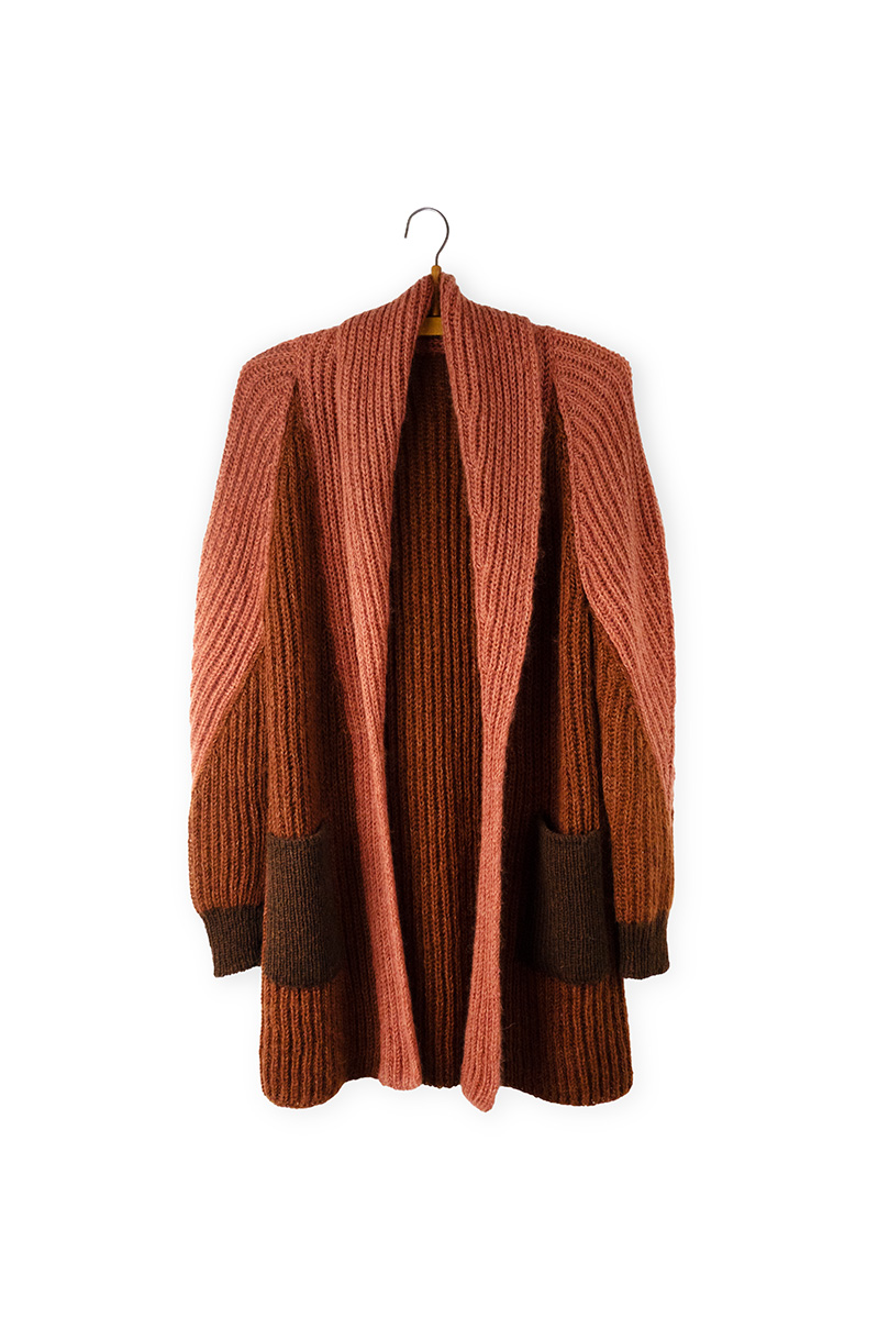 The cardigan is worked from the bottom-up and the brioche knitted parts are sewn together.