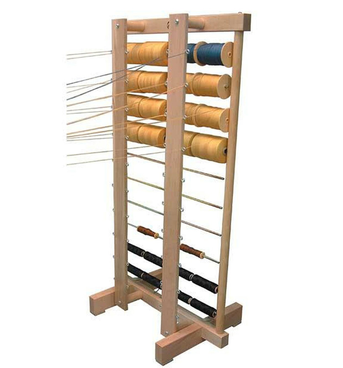 Can hold forty 4" (102 mm) spools. Built like a frame: 21" x 37" (53 cm x 94 cm) with two removable supports. The pins are fixed to a central post that can be turned out when removing bobbins.