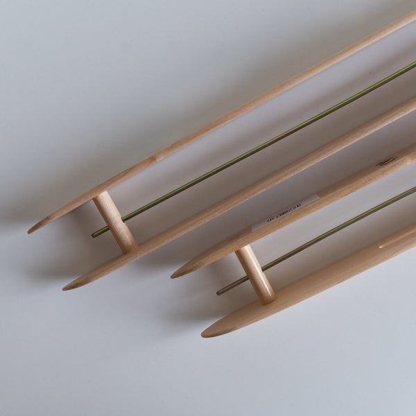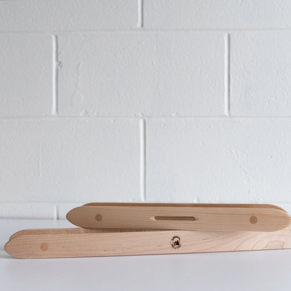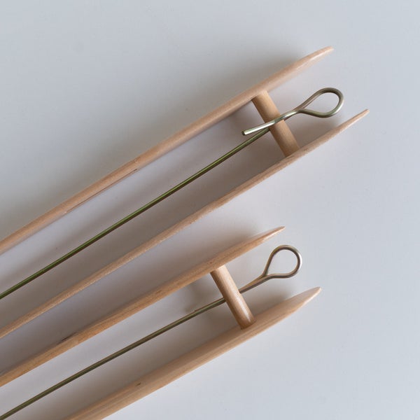 Rag Shuttle with removable central rod to hold one or many bobbins. There is a hole in the edge for the thread. You can wrap rags or thread around this shuttle, or use the removable rod to hold one or many bobbins. There is a hole in the edge to guide the weft. This shuttle is really nice for bulky thread and rug making!