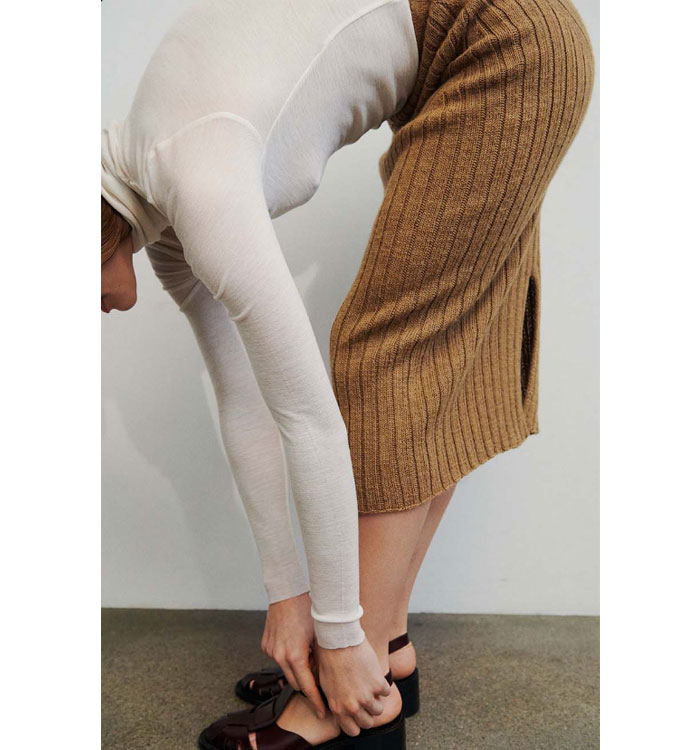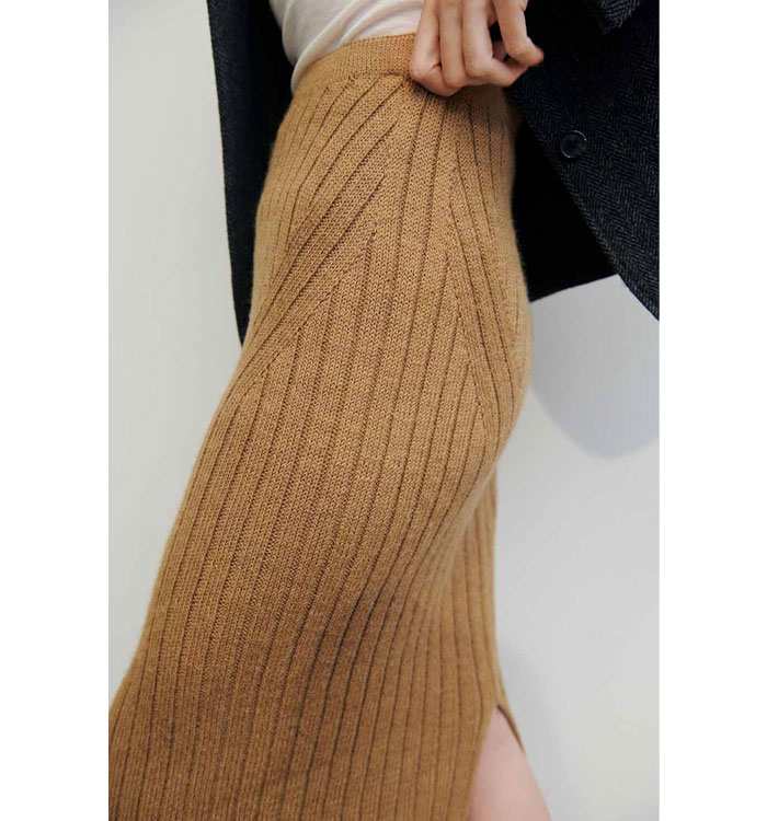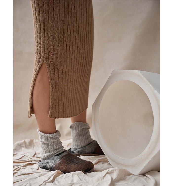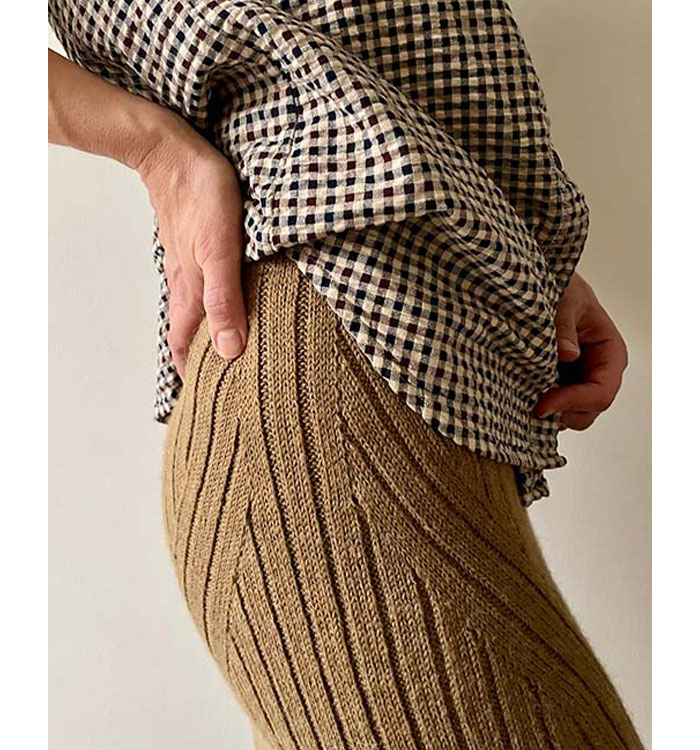 사용된 Isager Sock Yarn은 20% 재활용 나일론을 포함하여, 착용 중 스커트의 형태 변형을 방지합니다.