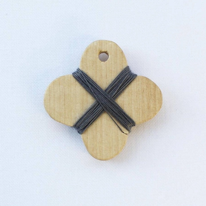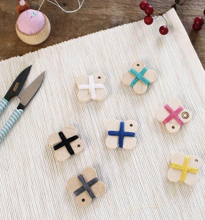 실은 토치노키 또는 일본산 밤나무로 만든 꽃 모양의 스풀에 감겨 있어 재봉 도구 키트에 가벼운 우아함을 더합니다.