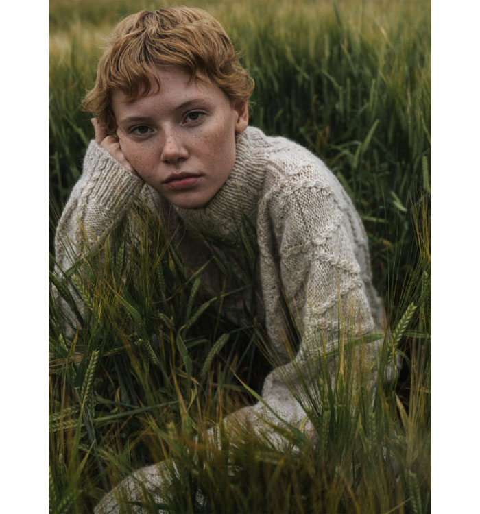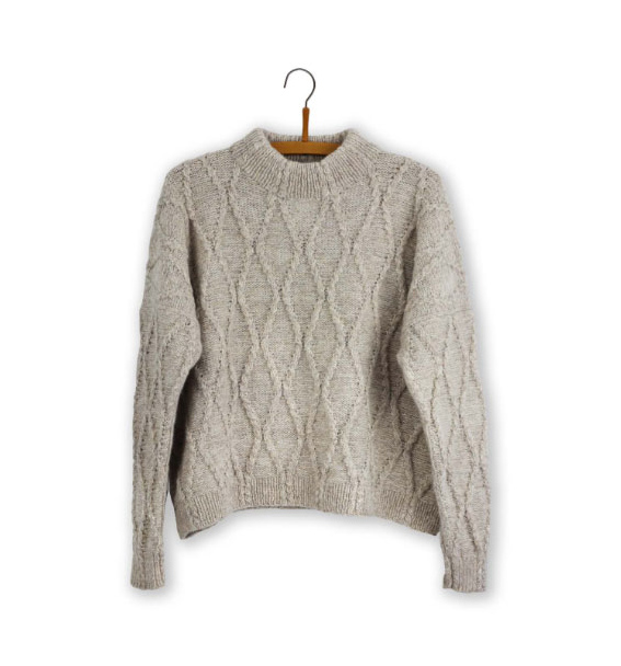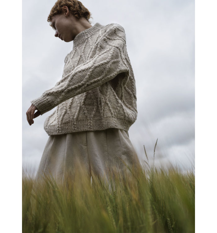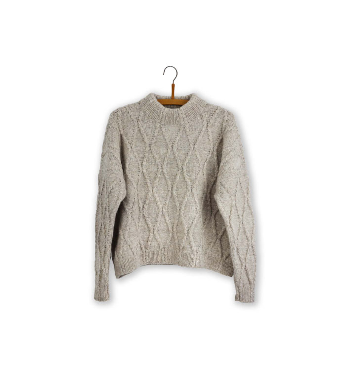 Isager의 Knitting Life 1 도서에 수록된 TWISTED CABLES SWEATER KIT 입니다. 차분하고 클래식한 느낌의 아란 스웨터로 교차되는 케이블 무늬가 돋보입니다.
