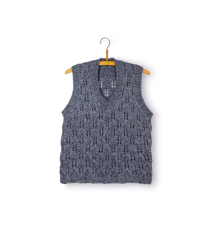 The vest is worked from the bottom up with a V-neck.