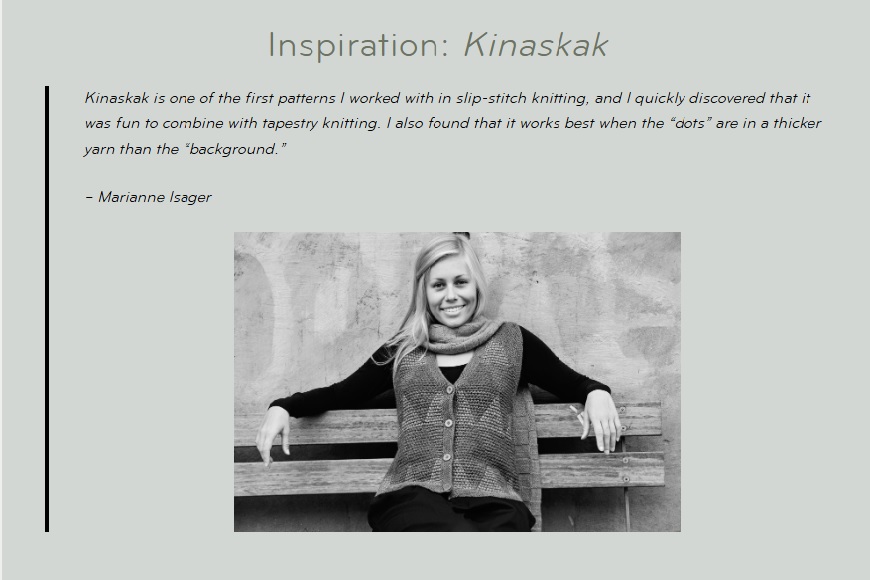 키나스카크는 제가 슬립 스티치 뜨기로 처음 작업했던 패턴 중 하나입니다. 곧 이 패턴이 태피스트리 니팅과 함께 사용하면 재미있다는 것을 발견했죠.