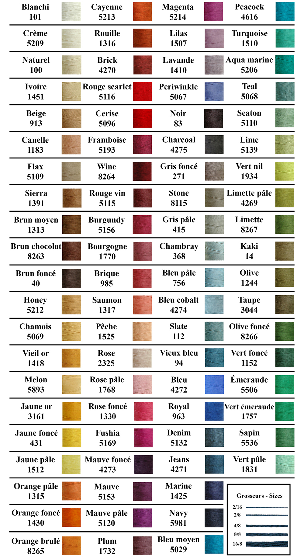 Maurice Brassard의 코튼 실은 80가지가 넘는 색상을 보유하고 있으며 여러 굵기의 실이 있으므로