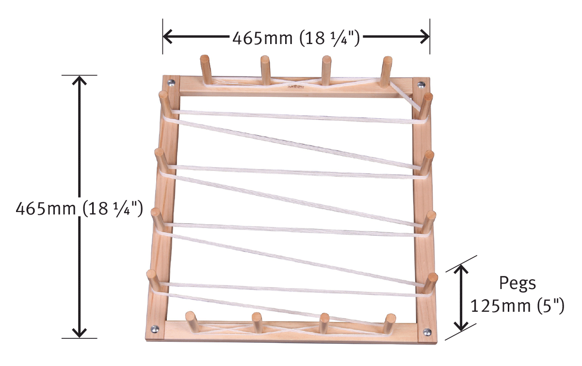 To create a warp of correct size and tension a warping frame is essential. This strong frame has pegs set firmly at regular intervals. The perfect accessory for your new Katie loom.