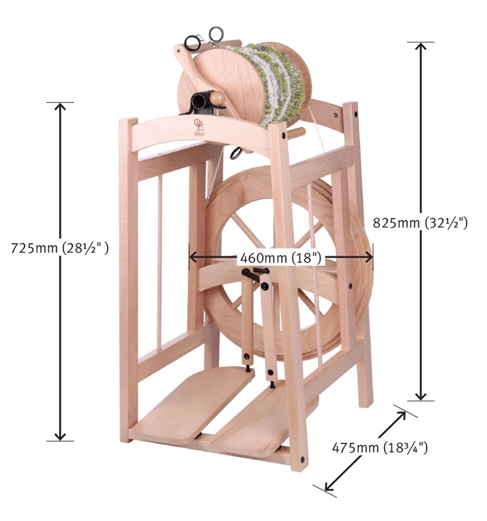 New 3 speed bobbin with easy 3, 4 & 5:1 ratios and capacity of up to 1kg 2.2lb. New polyurethane con-rod joints for smooth heal & toe treadling. Wider spaced treadle boards. Arched rails and factory assembled sides are easily assembled with bolts and barrel nuts. New maintenance free Polyurethane hinges for smooth & effortless treadling. Soft leather brake band and sensitive tension adjustment. Huge 27mm - 1 1/16” flyer orifice for really thick yarns. Provision for plying from 2 bobbins. New nylon universal bearings for the con rod.