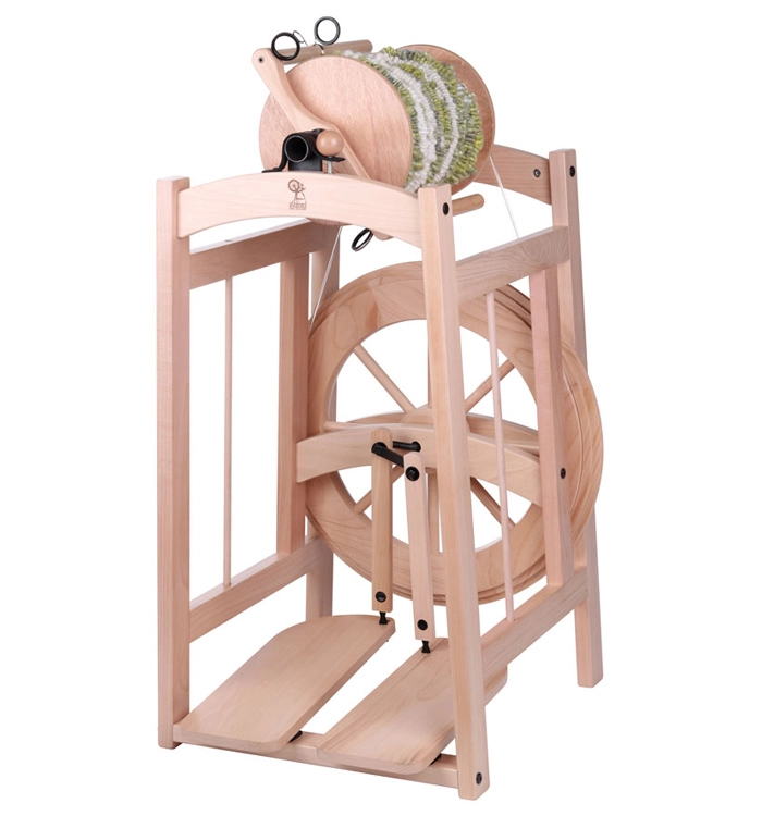 This is a specialist wheel designed to spin extra bulky yarn used in rug weaving and chunky knitting or for plying bulk quantities. The orifice is extra large. The ball bearings and double treadle allows for an easy start and treadling. The slow drive ratios and sensitive leather flyer brake system are ideal for creating unique novelty yarns.