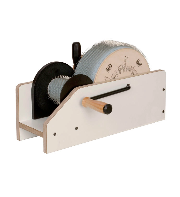 The Louet Drumcarders are made of laminated birch and have a hard white coating. In order to ensure a long life, the teeth on all Loue?t carders are made of high grade plated steel wire. All gearboxes (except on the Elite) are enclosed to prevent fibers entering the gear system.