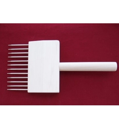 본 제품은 단풍나무로 제작되었고 덴마크산 오일로 마감처리 되었습니다, 너비는 4 1/2" 입니다. 12개의 스테인리스 칼이 1/4"에 하나씩 박혀 있습니다. 타피스트리 작업이나 러그 혹은 래그 위빙에 사용하시면 좋습니다.