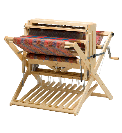 The weaving width of the Baby Wolf is 26". You have your choice of four or eight shafts, or you can choose our Four Now+Four Later model which allows you to expand from four shafts to eight shafts at any time. The X-frame design is exceptionally stable and can be easily folded to a depth of 18". The adjustable beater allows the position of the shuttle race to be raised or lowered if necessary. The Baby Wolf employs a friction brake on the warp beam which lets you advance the warp smoothly.