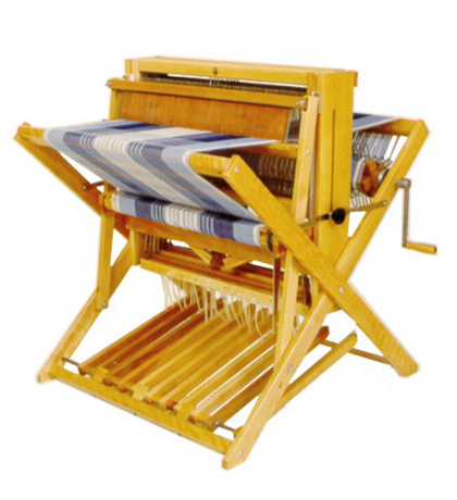 본 모델은 잭 타잎 플로어 룸으로써 가법지만 단단하고 쉽게 움직일수 있도록 접이식으로 디자인 되었습니다. 워크샵이나 시연시에 특화되어 디자인 되었습니다. 양 옆 핸들의 나사를 풀고 밀어 올리면 접히는 구조입니다. 작업 중간에도 접을 수 있도록 고안된 제품입니다. 쉬운 타이 업 작업을 위해 6개의 트레들이 거치되어 있습니다. 추가 종광을 연결하면 8종광으로도 작업이 가능합니다(트레들도 4개 추가). 1 7/8"(4cm) 의 레귤러 플레인 빔이 달려있으며, 갈퀴부품을 추가해서 섹셔널 워프빔으로도 사용이 가능합니다. 칼퀴부품은 확장부품 없이 빔에 바로 부착해야 합니다. 섹셔널 워프빔의 둘레는 15"(38cm) 입니다.