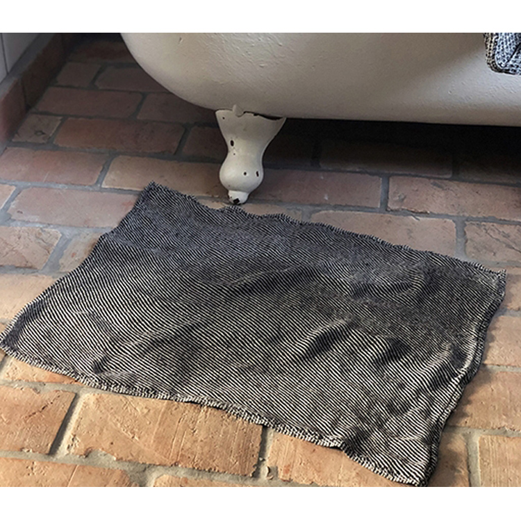 샤워 후, 바닥에 놓여진 Bath mat. 젖은 바닥을 닦고 다음 사용을 위해 걸어놔 두세요. 린넨은 높은 흡수율과 빠른 건조율로 이러한 욕실제품으로 매우 적합합니다. 100% 린넨 소재이며, 사이즈는 50cm x 70cm 입니다.
