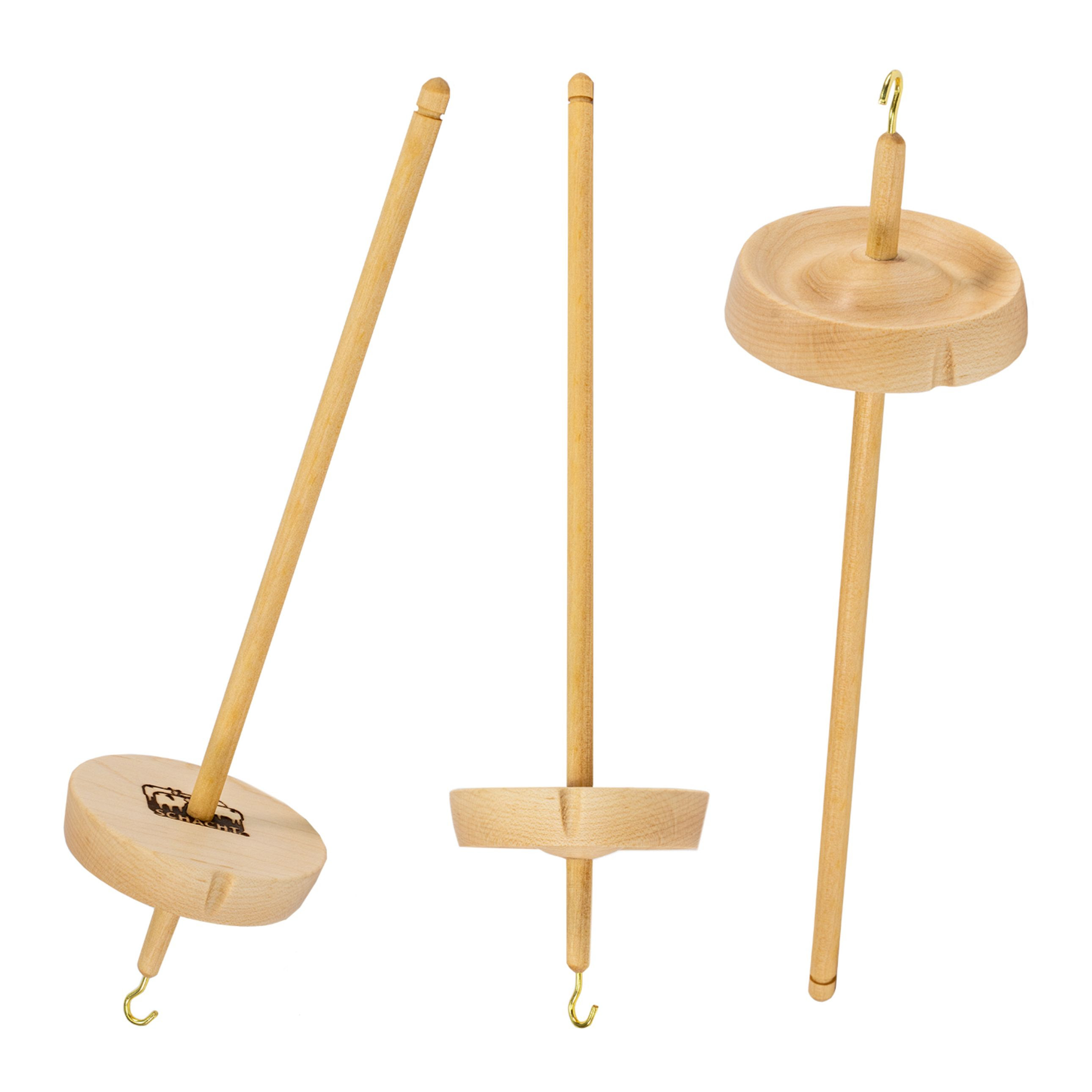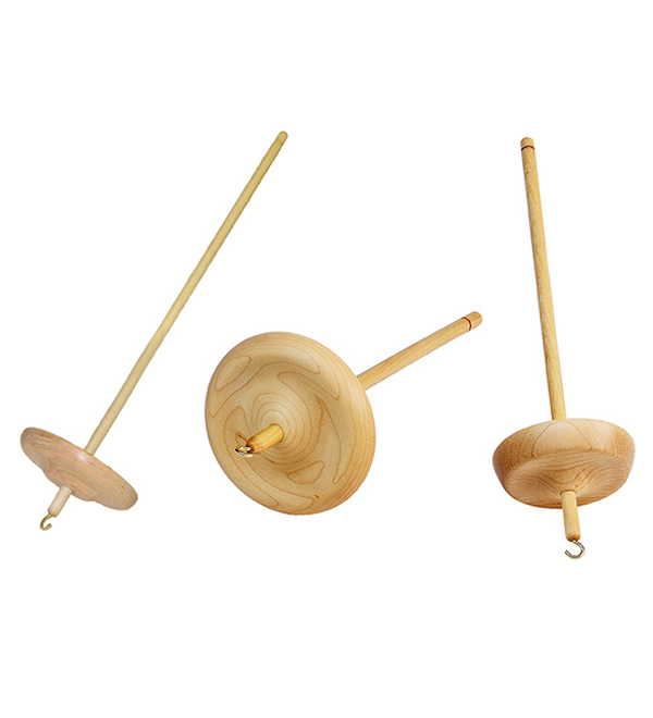 Our Hi-Lo Spindles offer the best of both whorls: a brass hook at the top for high-whorl spinning and a grooved shaft for low-whorl spinning. Three sizes offer a broad spectrum of spinning capabilities: 2″ (1.1 ounces), 3″ (2.2 ounces), and 4″ (3 ounces). Hi-Lo Spindles are made of hard maple.