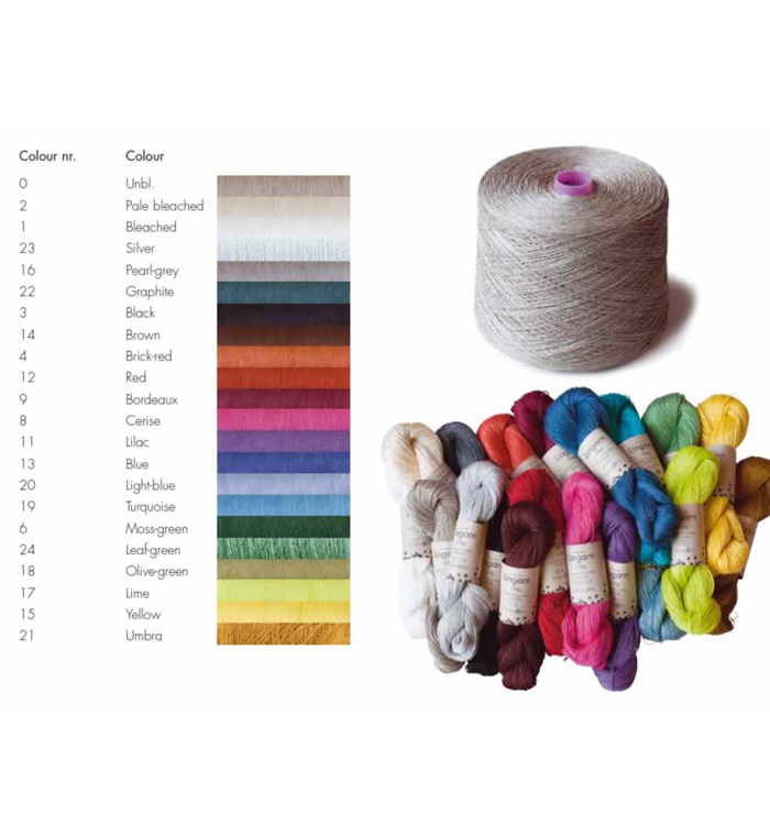 Our linen is woven with a linenyarn that is wet-spun and colored according to ecological criterias. 12/2 is now available as a 100g skein.